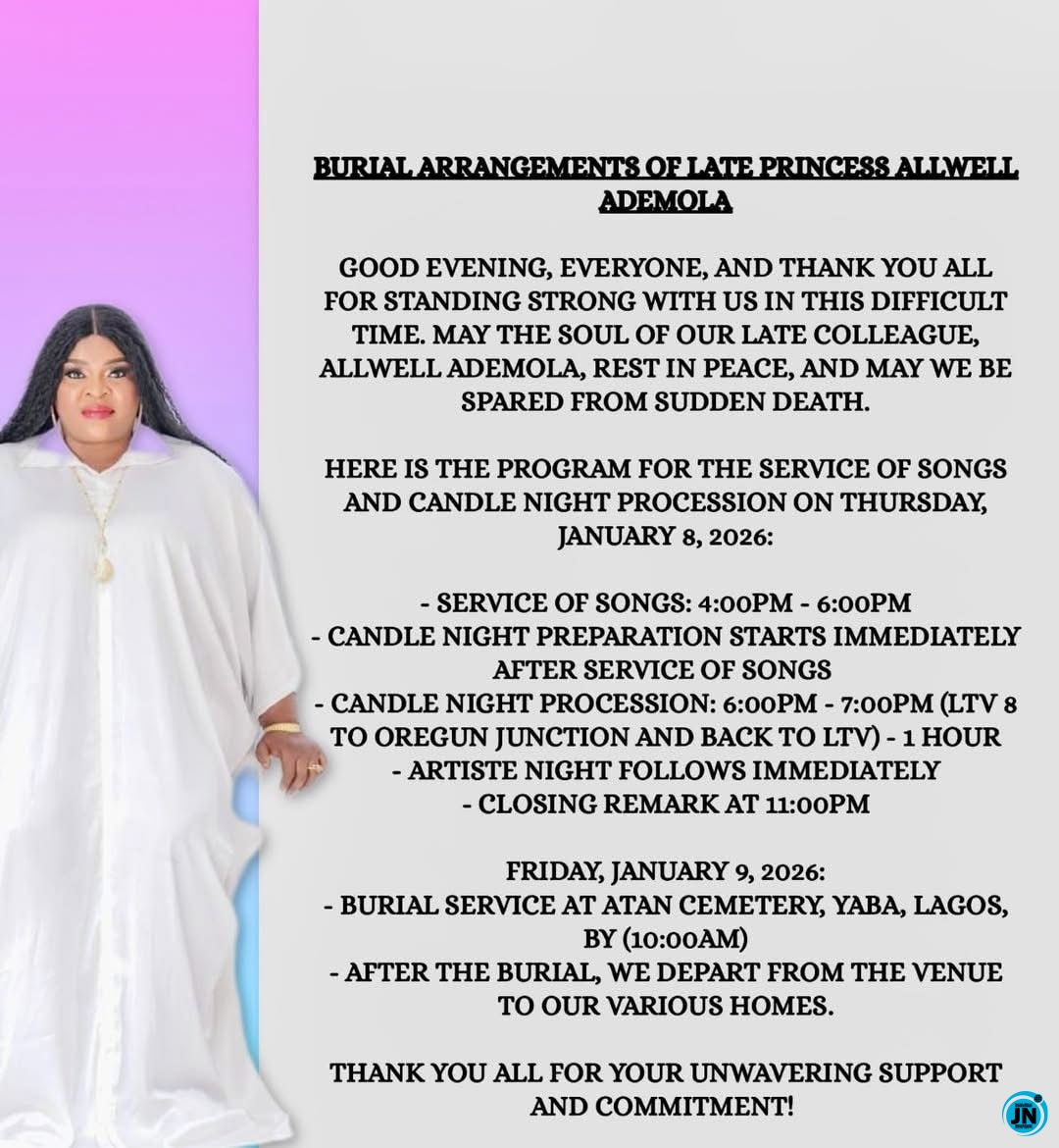 In a statement shared online, the family announced that a Service of Songs in memory of the actress will hold on Thursday, January 8, 2026. The event will be followed by a candlelight procession, allowing attendees to pay tribute to Allwell Ademola and celebrate her contributions to the Nigerian film industry.