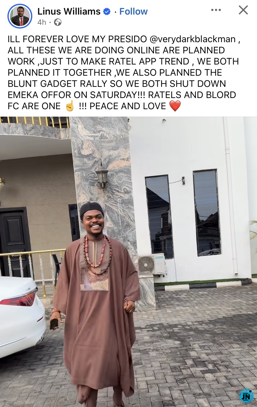 In his words: “ILL FOREVER LOVE MY PRESIDO @verydarkblackman, ALL THESE WE ARE DOING ONLINE ARE PLANNED WORK, JUST TO MAKE RATEL APP TREND, WE BOTH PLANNED IT TOGETHER, WE ALSO PLANNED THE BLUNT GADGET RALLY SO WE BOTH SHUT DOWN EMEKA OFFOR ON SATURDAY!!! RATELS AND BLORD FC ARE ONE S!!! PEACE AND LOVE”