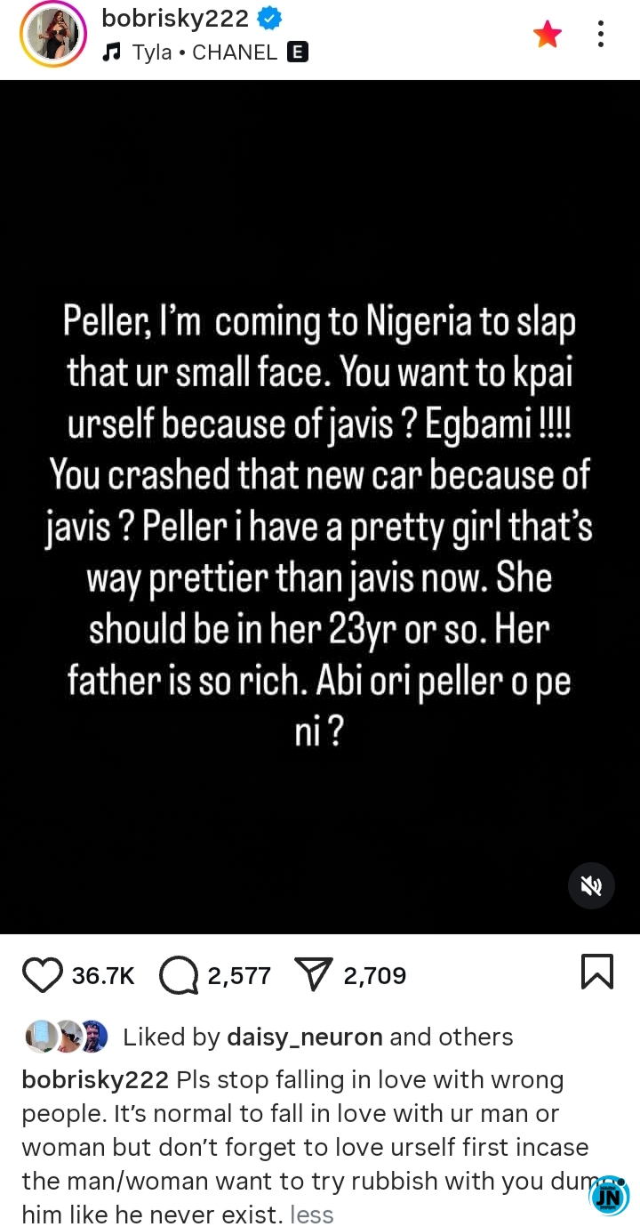 “Peller, I’m coming to Nigeria to slap that ur small face. You want to kpai urself because of javis? Egbami!!!! You crashed that new car because of javis? Peller ihave a pretty girl that’s way prettier than javis now. She should be in her 23yr or so. Her father is so rich. Abi ori peller o pe ni?