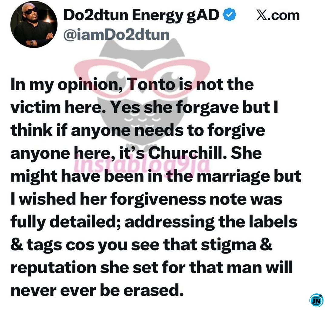 Dotun argued that if genuine forgiveness must take place, Churchill is the one who deserves it most, considering the damaging stories, public accusations, and labels that followed him long after the marriage ended.