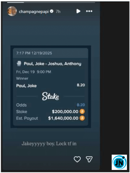 Ahead of the bout, Drake publicly revealed his $200,000 (approximately ₦296 million) wager on Jake Paul via his Instagram story, captioned: “Jakeyyyyy boy, lock tf in.”