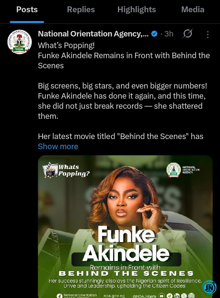 The Federal Government has publicly applauded renowned Nollywood actress, filmmaker, and producer Funke Akindele following the outstanding commercial success of her latest movie, Behind the Scenes, which has continued to dominate cinema screens across Nigeria and beyond.