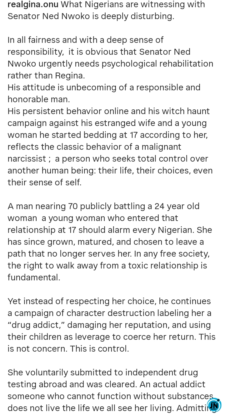 Socialite, Georgina Onuoha has strongly criticised Senator Ned Nwoko over his ongoing public dispute with his estranged wife, actress Regina Daniels, describing his conduct as troubling, excessive, and inappropriate for someone of his status.