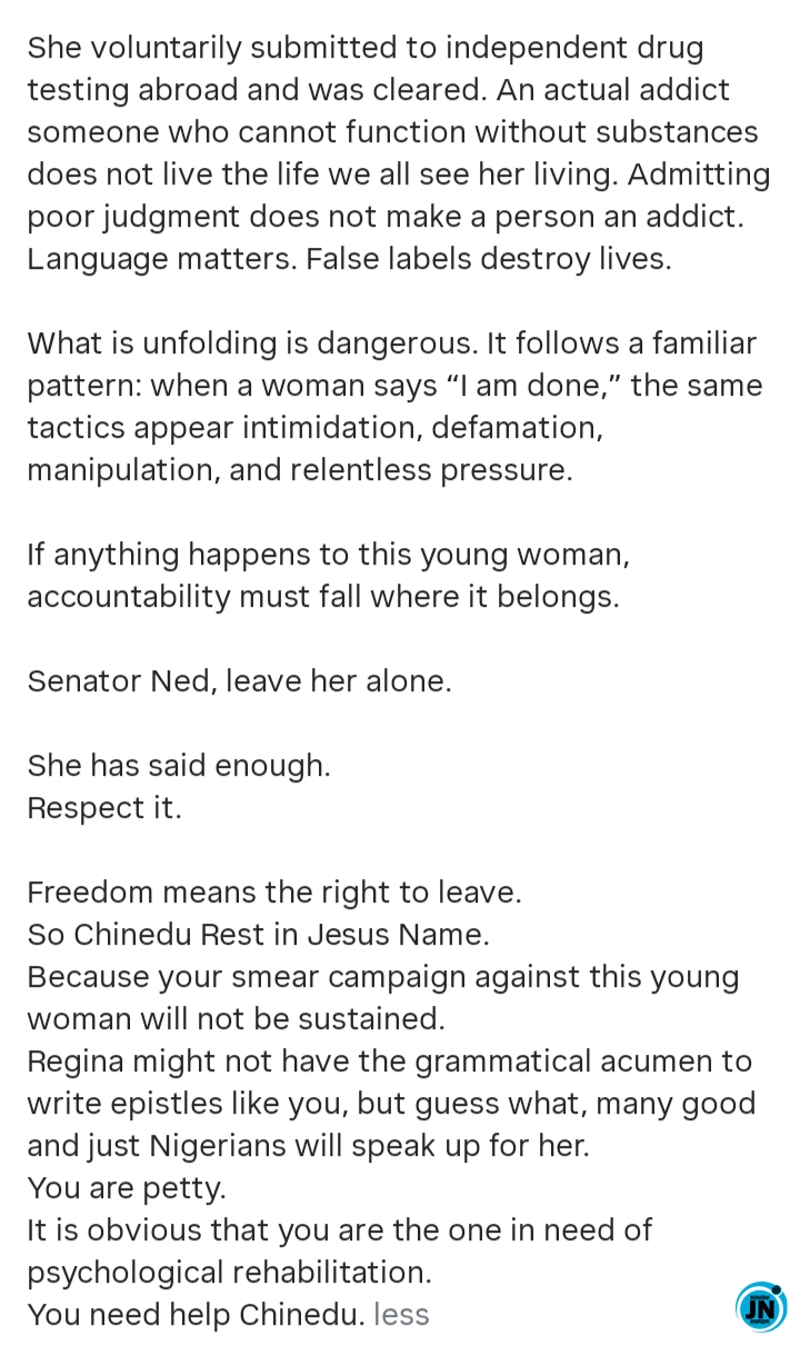 Onuoha further expressed concern about the age difference in the relationship, noting that Regina Daniels was still a teenager at the time the relationship began, and stressed that every individual has the right to leave relationships they no longer find safe, healthy, or fulfilling without fear of retaliation.