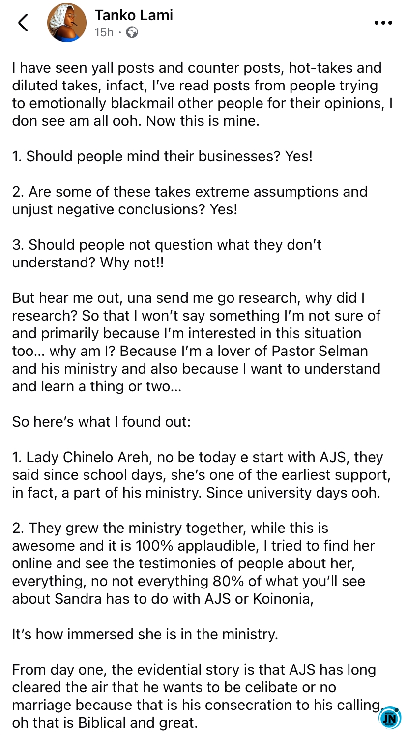 A Nigerian lady has sparked online discussions after sharing what she described as the results of her personal research into the long-standing relationship rumors surrounding Apostle Joshua Selman and Lady Sandra Areh. The lady, identified as Tanko Lami, explained that her curiosity and interest in understanding the dynamics between the two public figures prompted her to conduct detailed research, which she shared in a Facebook post that quickly gained attention among social media users.
