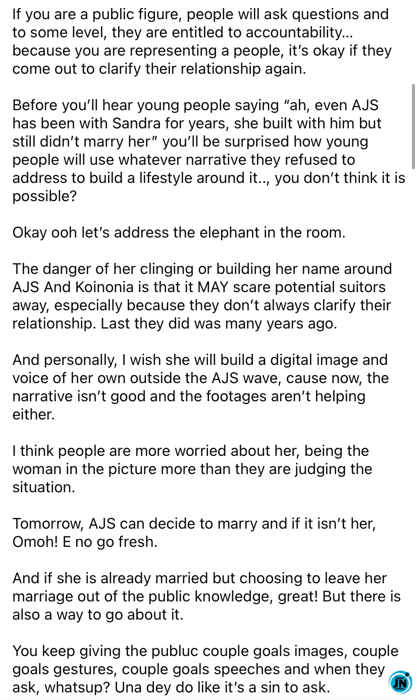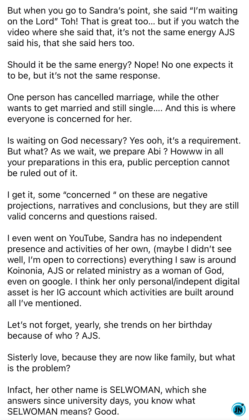 According to Tanko, the public perception surrounding Sandra’s close association with Selman can sometimes overshadow her individuality, creating narratives that may influence potential suitors. She observed that Sandra’s online presence and activities are largely centered on Koinonia and Apostle Selman’s ministry, with limited personal or independent digital assets aside from her Instagram account. This level of immersion in the ministry, combined with public couple-goals images and gestures, has contributed to speculation about their relationship status.