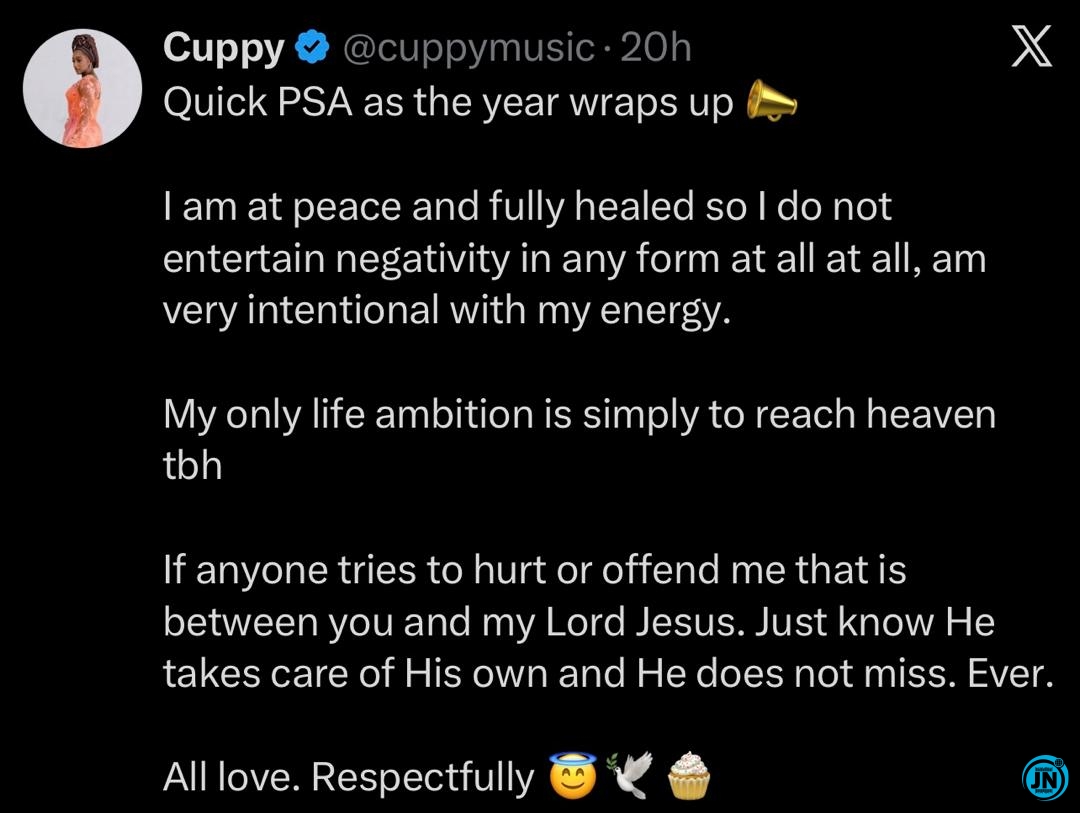 Popular Nigerian disc jockey, philanthropist, and media personality, DJ Cuppy, has stirred conversations across social media after sharing a deeply personal end-of-year message centered on peace, healing, faith, and the importance of setting healthy boundaries.