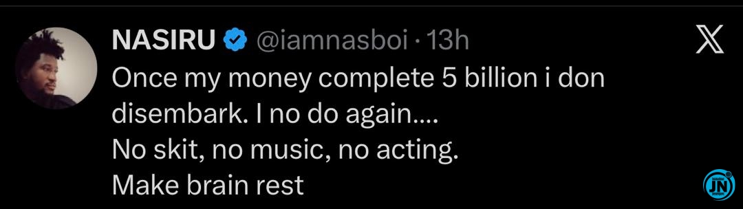 For Nasboi, the magic number is ₦5 billion, a figure he says will allow him to live comfortably without the constant demands of content creation, public scrutiny, and online pressure.