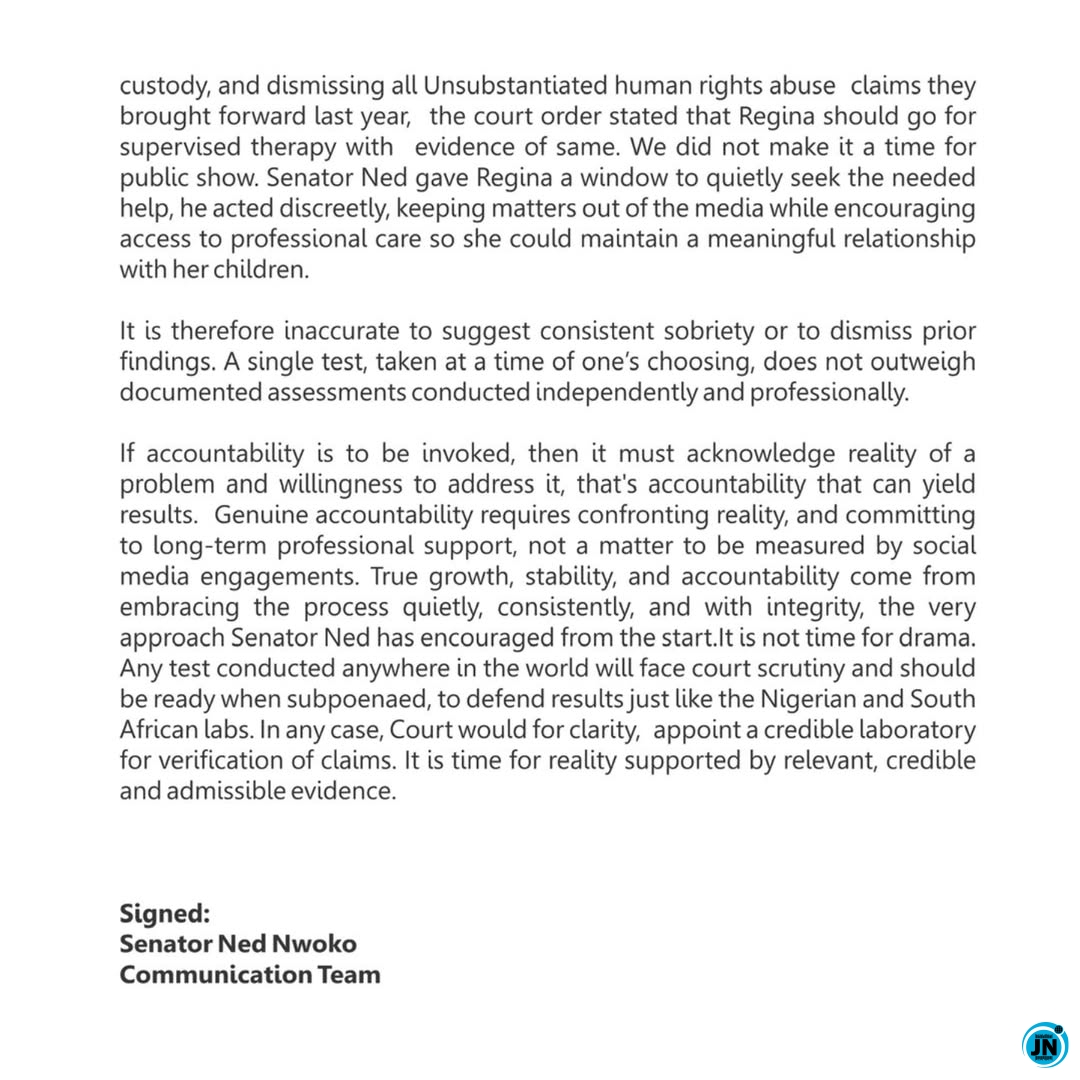 When the court gave judgement in favour of Senator Ned having custody, and dismissing all Unsubstantiated human rights abuse claims they brought forward last year, the court order stated that Regina should go for supervised therapy with evidence of same. We did not make it a time for public show. Senator Ned gave Regina a window to quietly seek the needed help, he acted discreetly, keeping matters out of the media while encouraging access to professional care so she could maintain a meaningful relationship with her children.