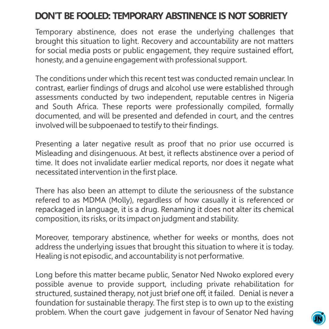 The conditions under which this recent test was conducted remain unclear. In contrast, earlier findings of drugs and alcohol use were established through assessments conducted by two independent, reputable centres in Nigeria and South Africa. These reports were professionally compiled, formally documented, and will be presented and defended in court, and the centres involved will be subpoenaed to testify to their findings.