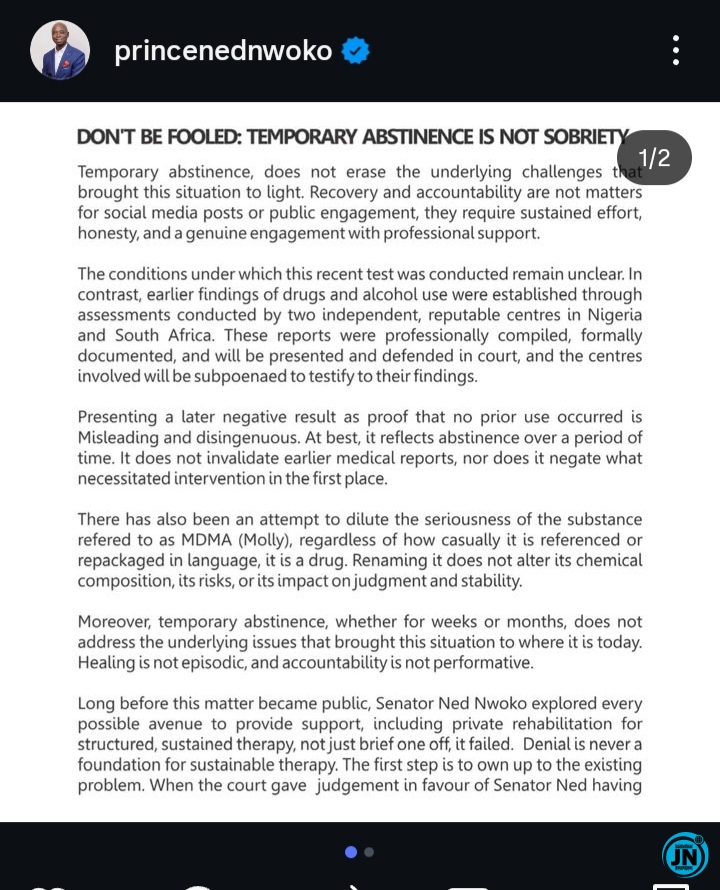 According to the statement, Senator Nwoko stressed that recovery from substance-related challenges is a complex and continuous process that requires consistency, accountability, and professional intervention, rather than what he termed public declarations or social media-driven narratives.