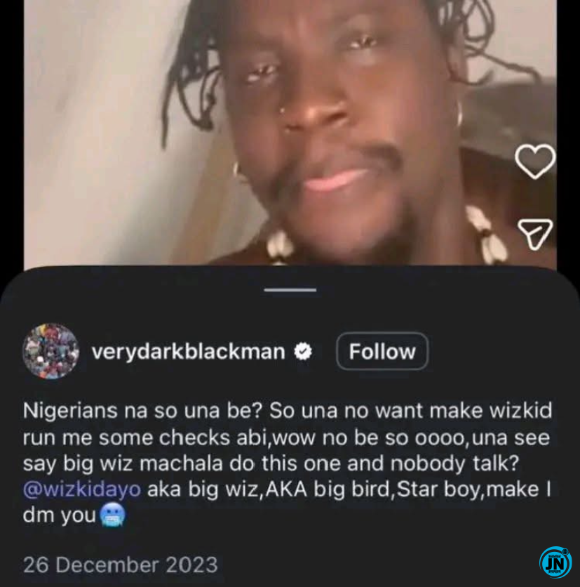 In the resurfaced post, VeryDarkMan appeared to be reaching out directly to Wizkid, seemingly seeking financial support or assistance from the singer. He also expressed frustration toward Nigerians, accusing them of not helping him get support from Wizkid. The post read: “Nigerians na so una be? So una no want make wizkid run me some checks abi, wow no be so oooo, una see say big wiz machala do this one and nobody talk? @wizkidayo aka big wiz, AKA big bird, Star boy, make 1 dm you.”