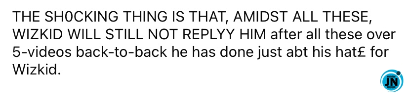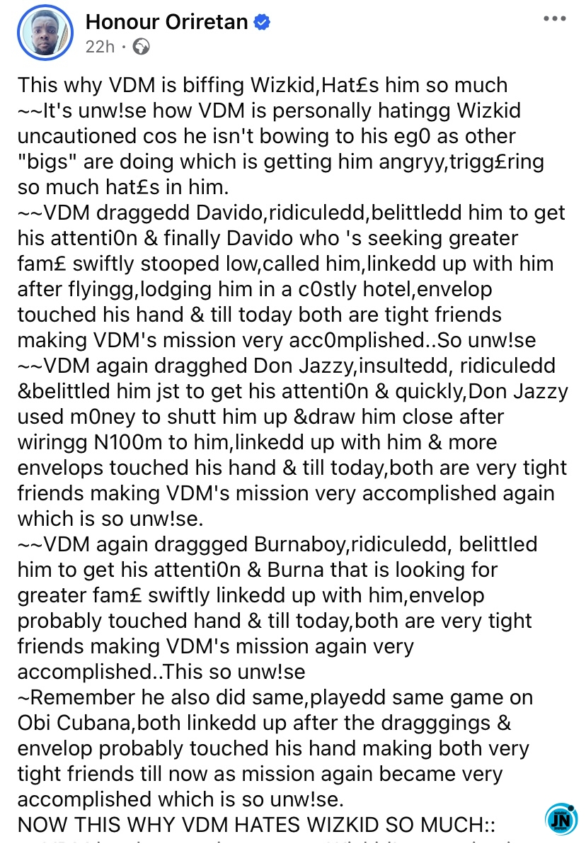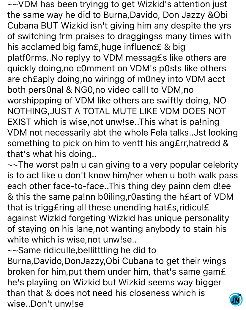“VDM has been tryingg to get Wizkid’s attention just the same way he did to Burna, Davido, Don Jazzy & Obi Cubana BUT Wizkid isn’t giving him any despite the yrs of switching frm praises to draggingss many times with his acclaimed big fame, huge influence & big platforms.. No replyy to VDM messages like others are quickly doing, no cOmment on VDM’s pOsts like others are cheaply doing, no wiringg of mOney into VDM acct both persOnal & NGO, no video calll to VDM, no worshippping of VDM like others are swiftly doing, NO NOTHING, JUST A TOTAL MUTE LIKE VDM DOES NOT EXIST which is wise, not unw!se. This what is pa!ning VDM not necessarily abt the whole Fela talks..Jst looking something to pick on him to ventt his angErr, hatredd & that’s what his doing..”