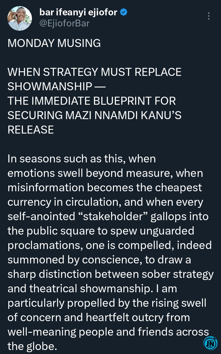 The legal representative of the Indigenous People of Biafra (IPOB), Ifeanyi Ejiofor, has issued a detailed warning regarding the recent life sentence handed down to Nnamdi Kanu, cautioning that any appeal or legal response initiated hastily, without strategic political alignment and comprehensive coordination, would inevitably fail. He stressed that any legal approach at this stage must be underpinned by careful planning and engagement with influential political actors to have a chance of success.
