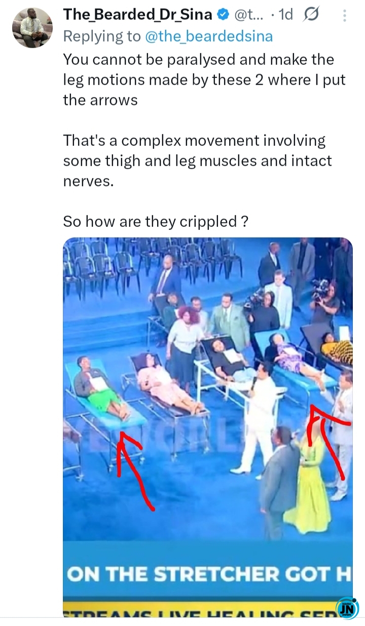 “I took a look at this Pastor Chris’ video and as a medic I slowed it down and examined critically.I zoomed into the legs of the so called ” crippled” and here is what I’d say