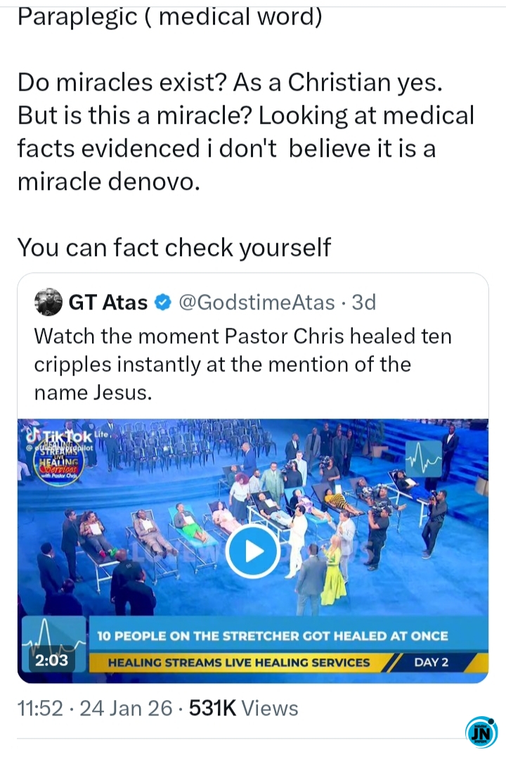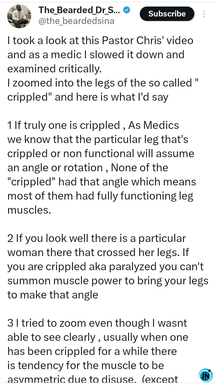A Nigerian medical doctor, Dr Sina, has publicly reacted to a viral miracle video involving Pastor Chris Oyakhilome, stating that based on medical facts and professional observation, he does not believe the incident qualifies as a genuine miracle.
