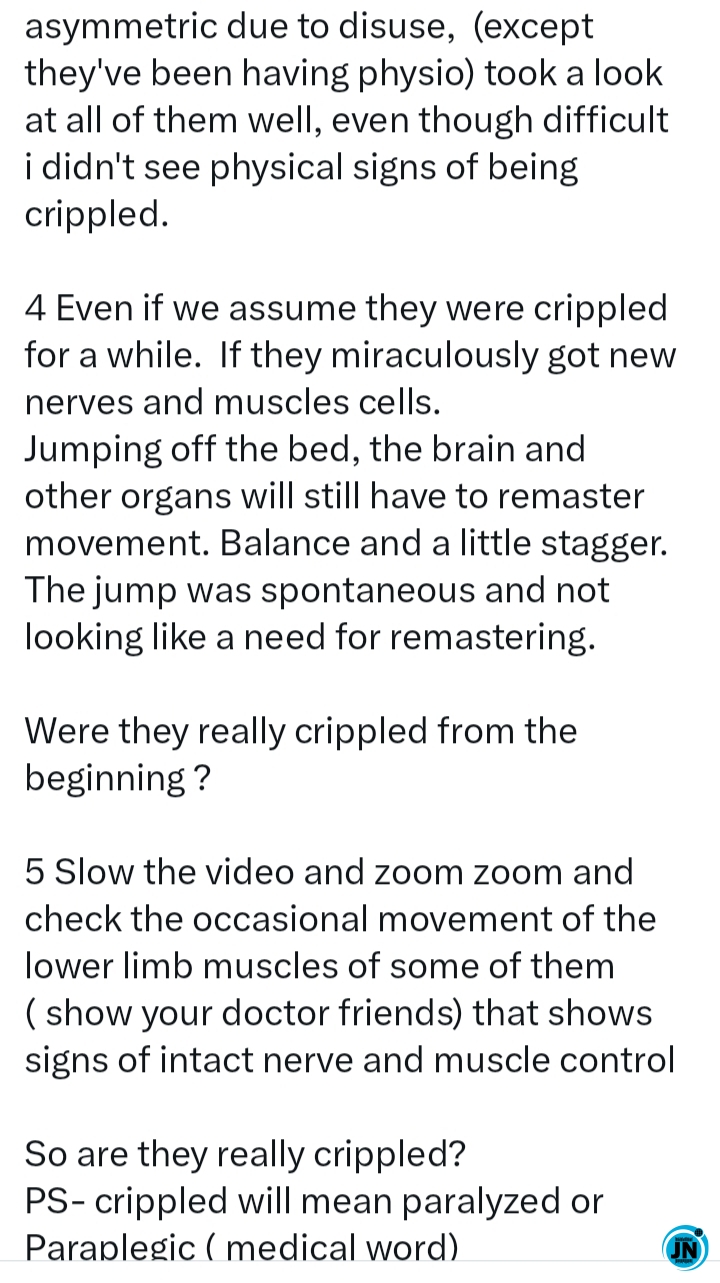 According to him, several physical, muscular, and neurological signs typically seen in paralyzed or long-term crippled patients were noticeably absent in the footage.