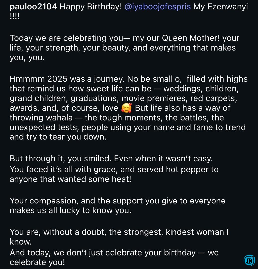 Taking to his Instagram page, Paulo poured out his heart in a touching tribute, praising Iyabo for her strength, beauty, compassion, and resilience.