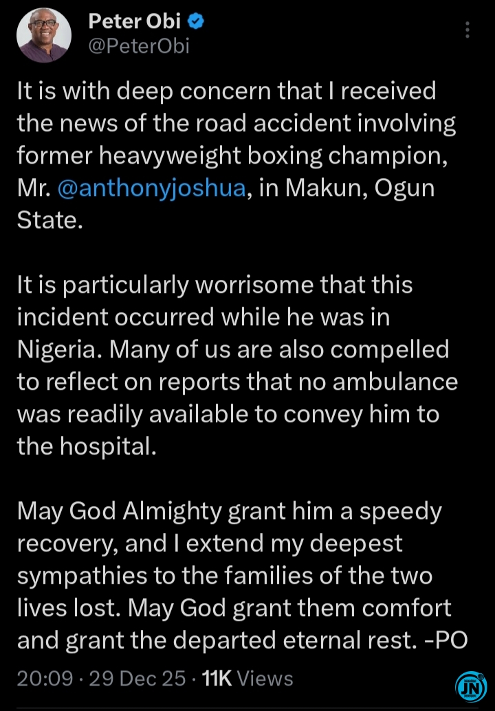 “It is with deep concern that I received the news of the road accident involving former heavyweight boxing champion, Mr. @anthonyjoshua, in Makun, Ogun State,” Obi said in a statement. “It is particularly worrisome that this incident occurred while he was in Nigeria. Many of us are also compelled to reflect on reports that no ambulance was readily available to convey him to the hospital.”