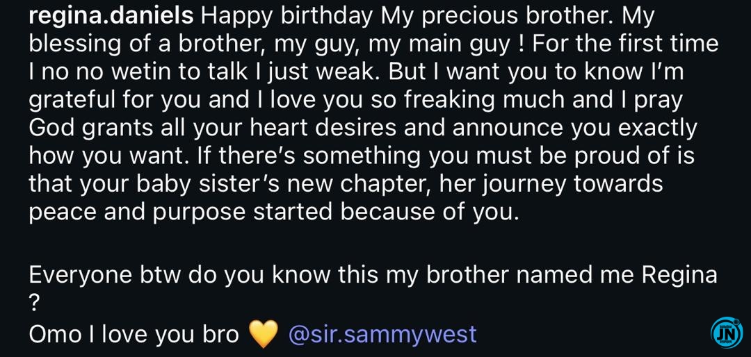 If there’s something you must be proud of, it’s that your baby sister’s new chapter, her journey towards peace and purpose, started because of you. Everyone, btw, do you know that my brother named me Regina? Omo, I love you bro @sir.sammywest.”