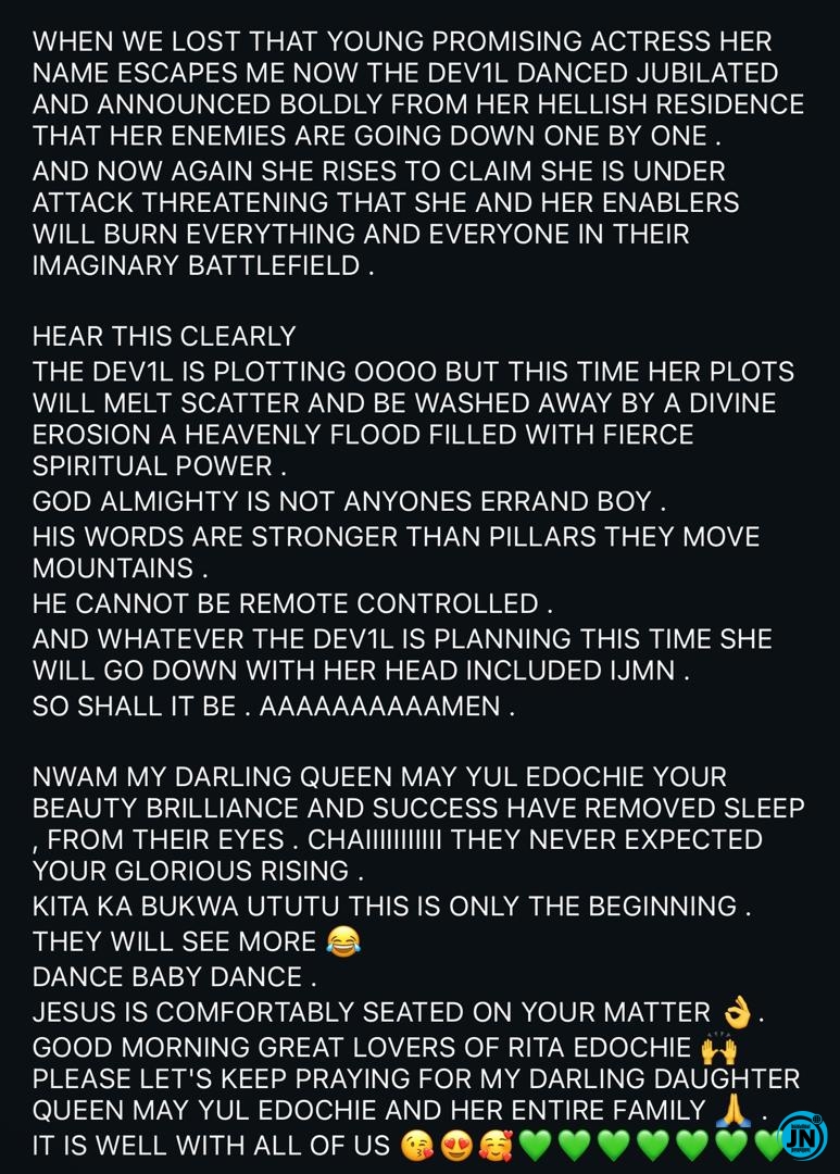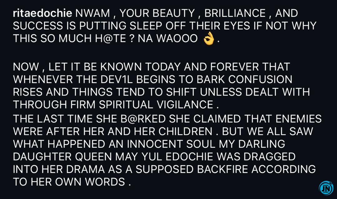 Nollywood actress, Rita Edochie has reacted strongly to the recent accusations made by Yul Edochie’s second wife, Judy Austin, who alleged she was being spiritually targeted by a supposed “witch.”