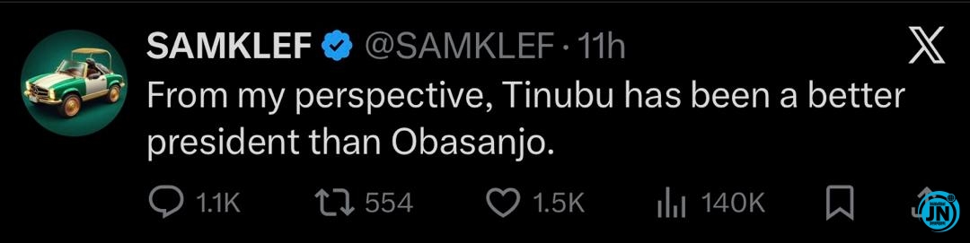 In a post on X (formerly Twitter), Samklef highlighted what he sees as Tinubu’s strengths, particularly his decisiveness, economic reforms, and strategies for tackling national security issues. He praised the current president’s hands-on approach, arguing that it is well-suited to address the complex economic and security challenges facing Nigeria today. According to Samklef, Tinubu stands out because of his willingness to make bold decisions, actions he believes many previous leaders would have avoided or delayed.