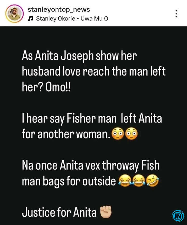 The Instagram post reads: “As Anita Joseph show her husband love, the man leave her. I hear sey fisherman left Anita for another woman. Na so Anita vex throw away fishman bags outside.” This statement has left fans divided, with some expressing sympathy for the actress and others questioning the authenticity of the claims.
