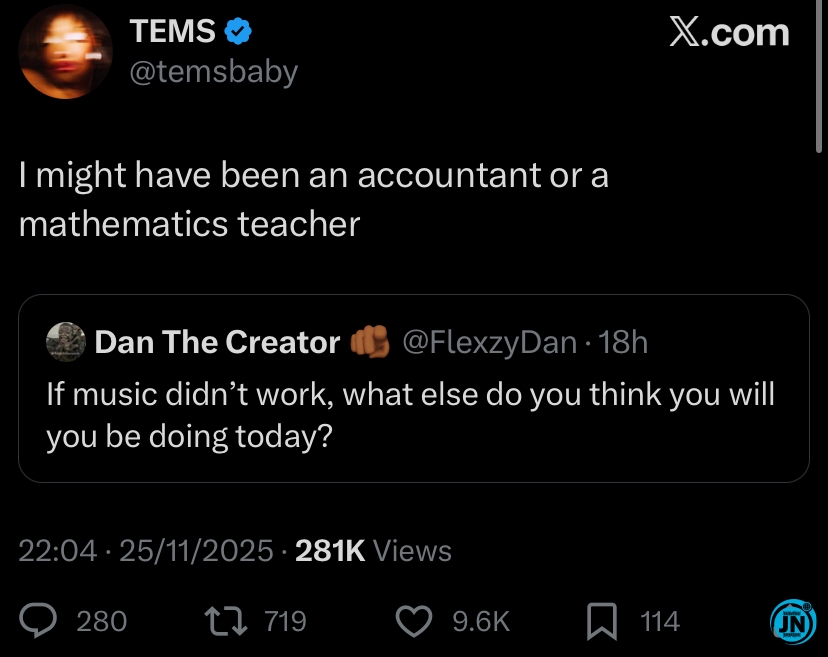 In response, Tems openly admitted: “I would have been a mathematics teacher or maybe an accountant.”