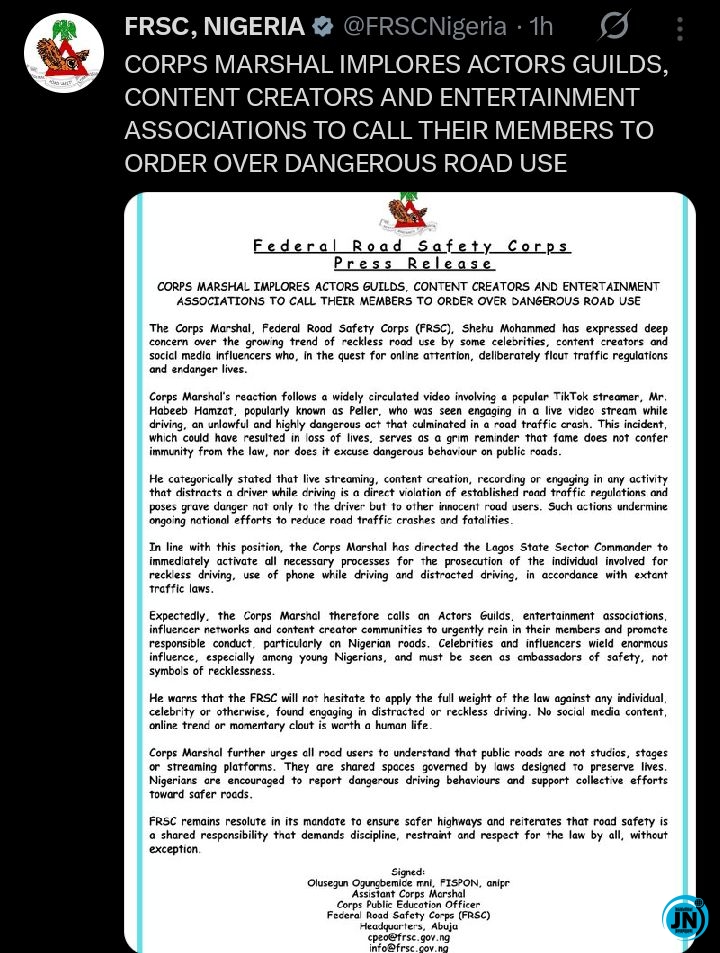 The Corps Marshal of the FRSC, Shehu Mohammed, expressed deep concern over the rising trend among celebrities and social media influencers who engage in dangerous acts on public roads simply to generate content for their followers. He described such acts as "disturbing" and warned that they set a poor example for young Nigerians who may view influencers as role models.