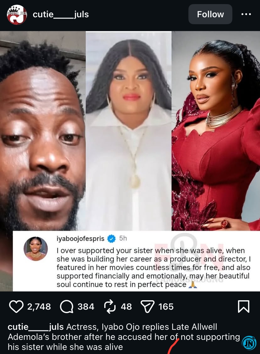 In response to the public outcry, actress Iyabo Ojo, who was reportedly mentioned in the brother’s video, issued a strong defense, asserting that she had consistently supported Allwell throughout her career. Iyabo stated that she worked with the late filmmaker multiple times without collecting payment, provided emotional guidance, and even extended financial assistance to help Allwell grow in Nollywood.