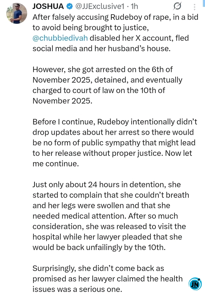 According to recent updates shared by X user JJExckusive, the married woman fled her husband’s residence shortly after posting the allegations. She was subsequently arrested on November 6, 2025, in connection with the defamation case against Rudeboy. JJExckusive also noted that Rudeboy deliberately chose not to share details of her arrest publicly, aiming to prevent any public sympathy that might affect legal proceedings.