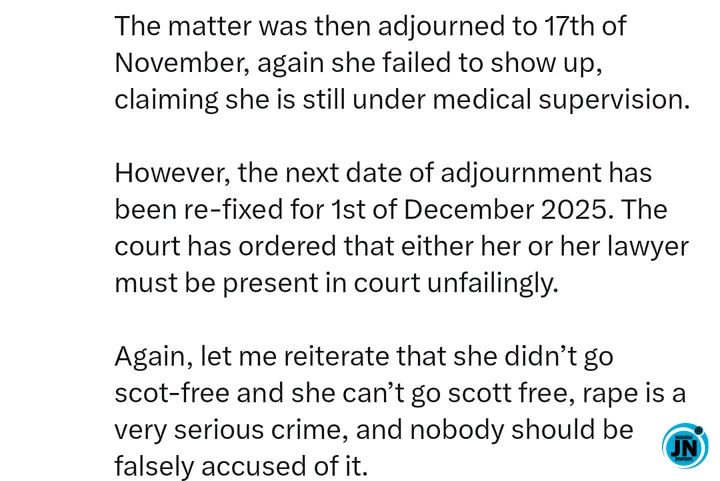 However, the next date of adjournment has been re-fixed for 1st of December 2025. The court has ordered that either her or her lawyer must be present in court unfailingly.