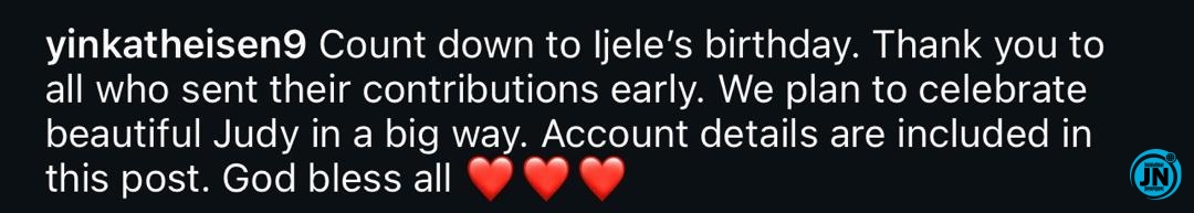 In her Instagram post, Yinka wrote: “Countdown to Ijele’s birthday. Thank you to all who sent their contributions early. We plan to celebrate beautiful Judy in a big way. Account details are included in this post. God bless all.” Her message not only conveyed excitement for the birthday but also served as a call to action for fans and well-wishers who wish to participate in making the event special.