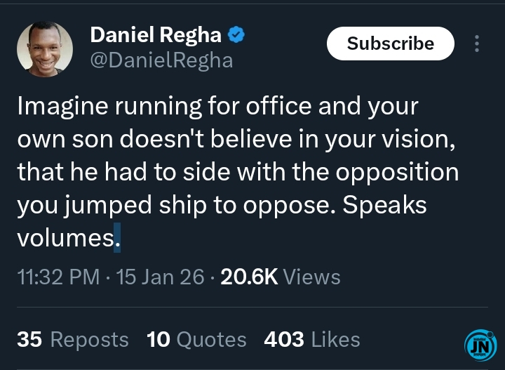 Reacting to the development, Daniel Regha shared his thoughts on social media, questioning the political and familial implications of Abba Abubakar’s decision. In his post, Regha reflected on the irony of a father running for high office while his own son appears to reject his vision and align with the opposition. He wrote: