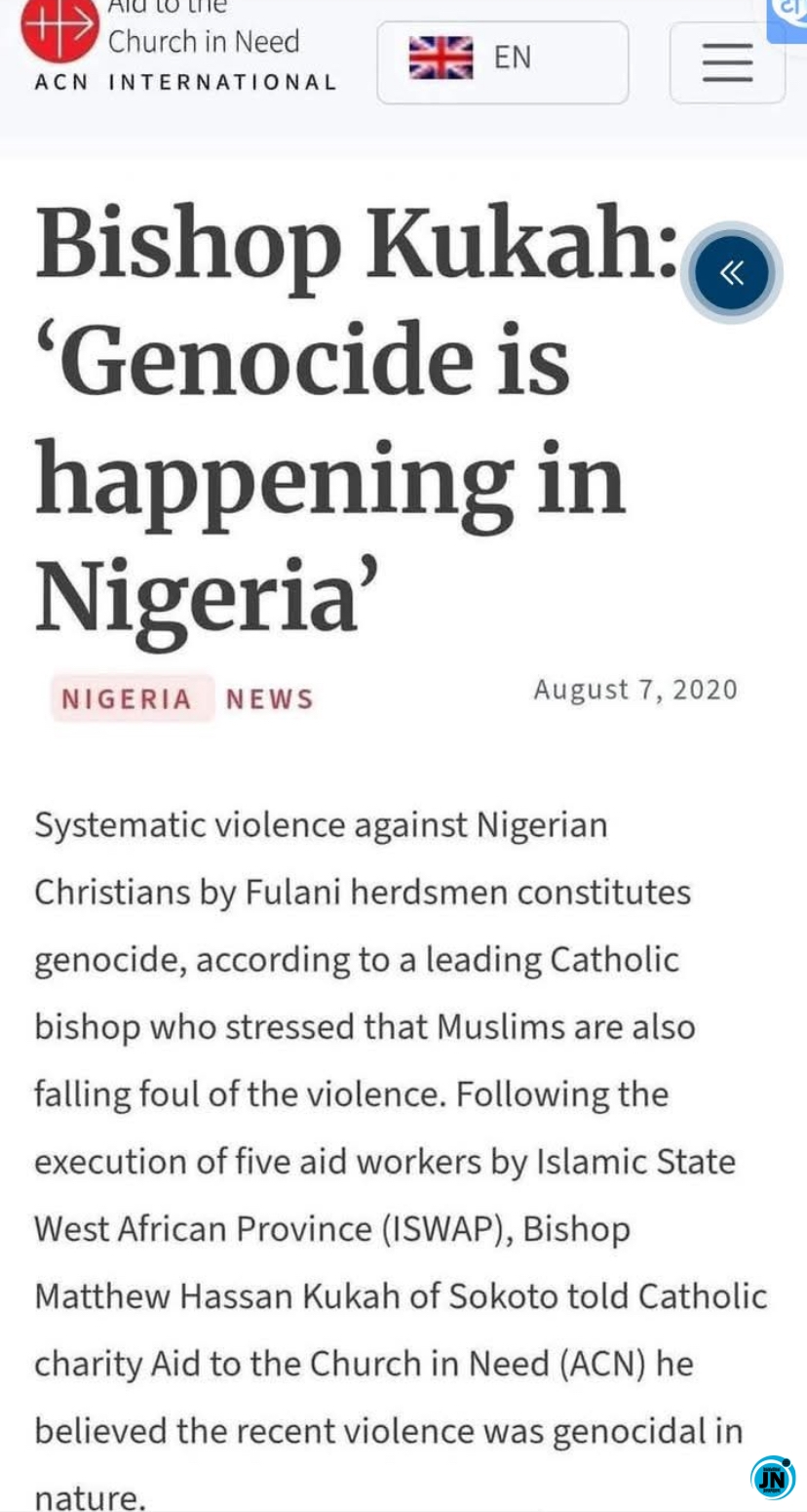 However, social media users quickly reshared Bishop Kukah’s 2020 comments, in which he appeared to describe violence against Christians [/b]as genocidal.