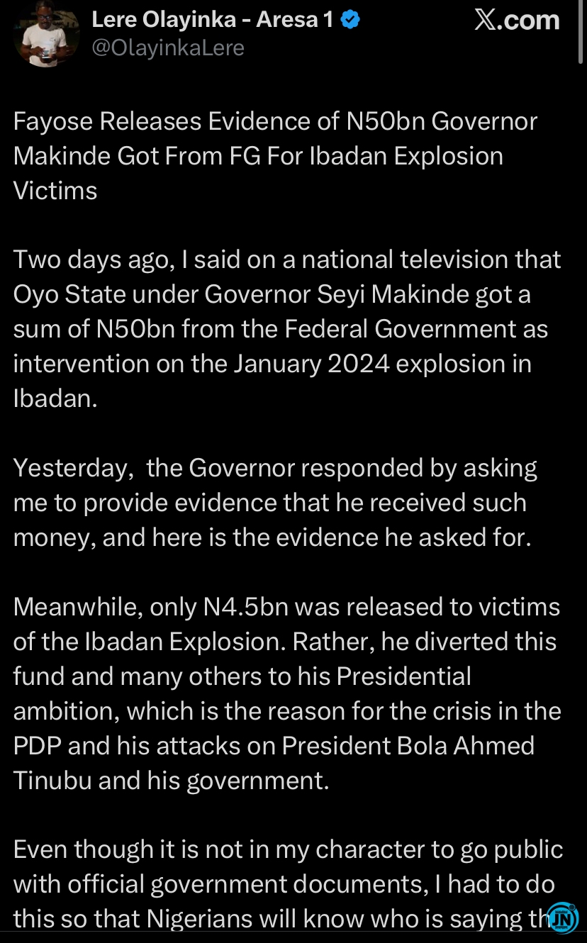 Former Ekiti State Governor Ayo Fayose has publicly released documents claiming that Oyo State Governor Seyi Makinde received a total of N50 billion from the federal government under President Bola Ahmed Tinubu’s administration. According to Fayose, the funds were part of a special intervention package intended to address the aftermath of the January 2024 explosion in Ibadan, an incident that caused significant destruction and loss of lives across several communities.