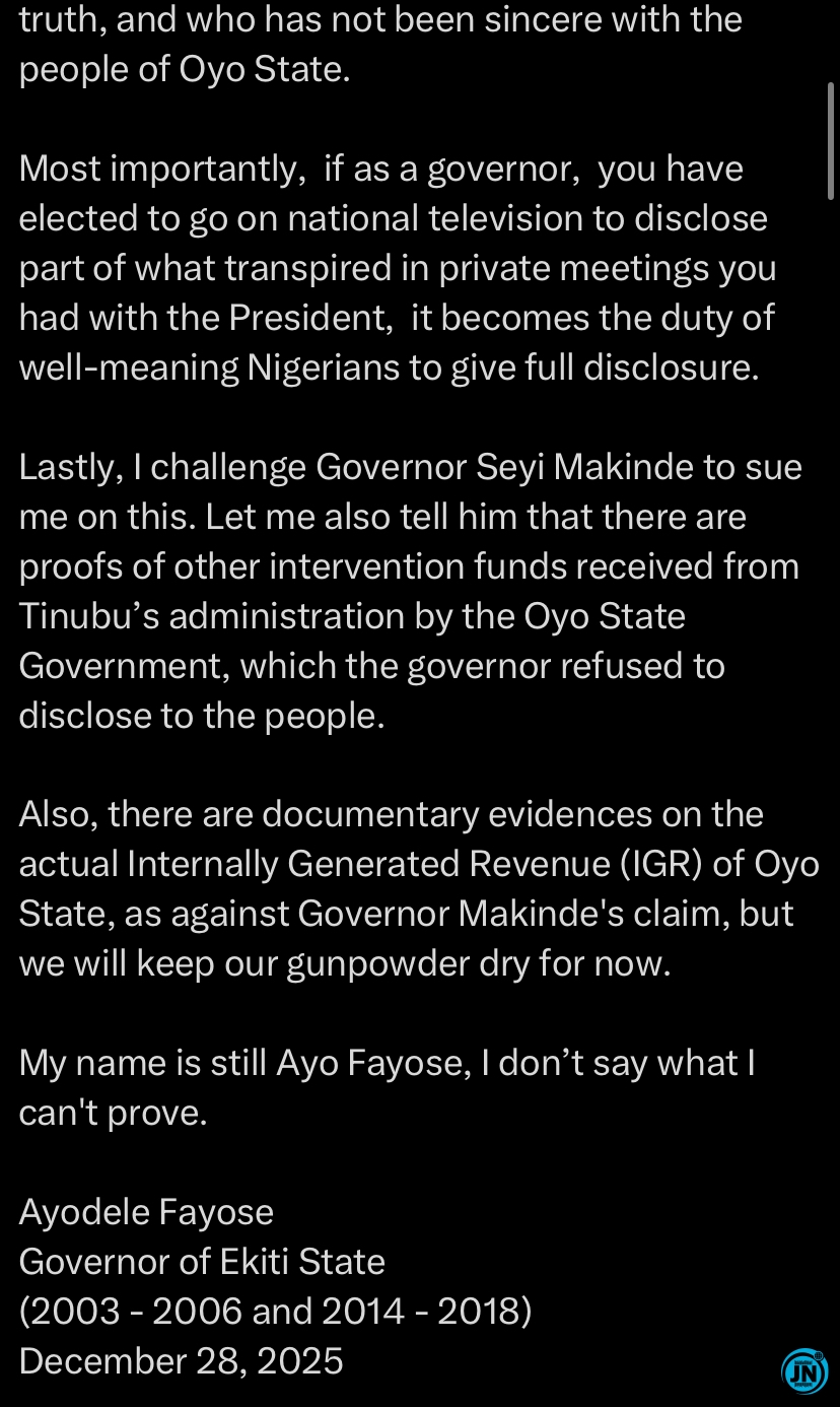 “I dare Governor Seyi Makinde to sue me on this,” Fayose stated emphatically. “There are also proofs of other intervention funds from Tinubu’s administration that the Oyo State Government received but did not make public.” He added that these documents and records can corroborate his claims and challenge the governor to address the allegations transparently.