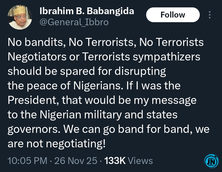 According to Babangida, continued negotiations with armed groups only embolden them and give them room to regroup, while innocent Nigerians continue to suffer in their hands.