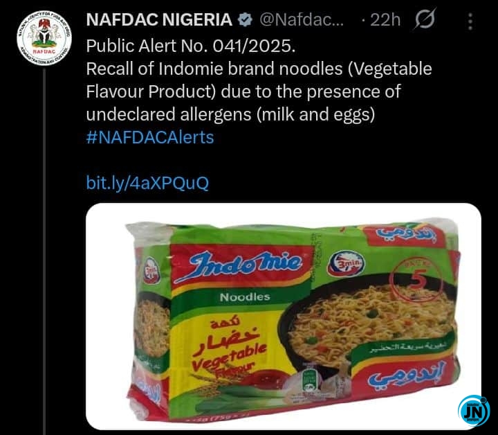 The National Agency for Food and Drug Administration and Control (NAFDAC) has issued a public health alert warning Nigerians against the consumption of recalled Indomie Vegetable Flavour noodles due to the presence of undeclared allergens.