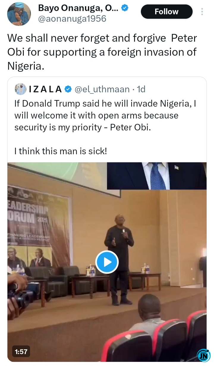 Bayo Onanuga reacted sharply to a video that captured Peter Obi commenting that he would accept external assistance to help tackle insecurity in Nigeria. In the video, Obi referenced Trump’s statement, implying that international help could support efforts to curb the ongoing violence and killings across the country. Onanuga interpreted this as an endorsement of foreign military intervention, which he described as highly unacceptable.