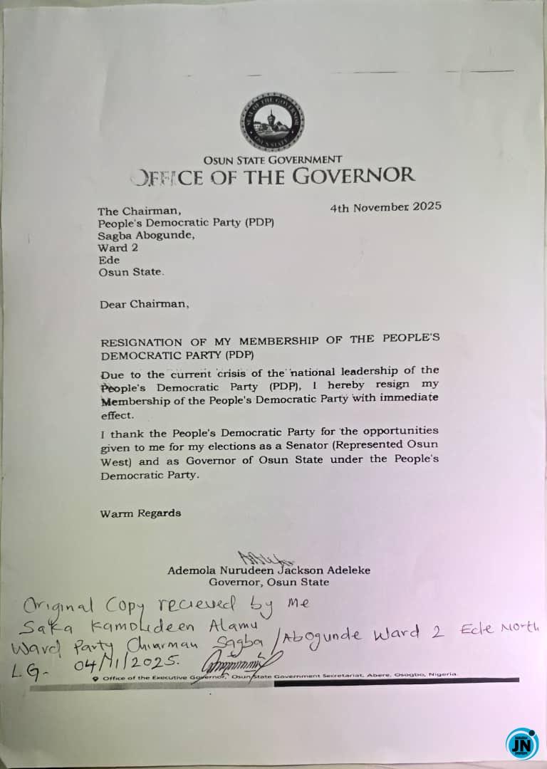 Governor Adeleke’s departure from the PDP became official when he submitted his resignation letter on 4 November 2025 to party leaders in Sagba Abogunde, Ward 2, Ede North Local Government Area. In the letter, Adeleke cited the worsening national leadership crisis within the PDP as the primary reason that made his continued membership untenable.