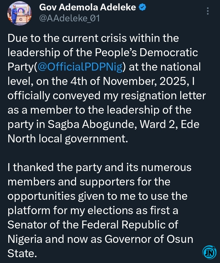 “Due to the current crisis within the leadership of the People’s Democratic Party (@OfficialPDPNig) at the national level, on the 4th of November, 2025, I officially conveyed my resignation letter as a member to the leadership of the party in Sagba Abogunde, Ward 2, Ede North local government,” Adeleke wrote.