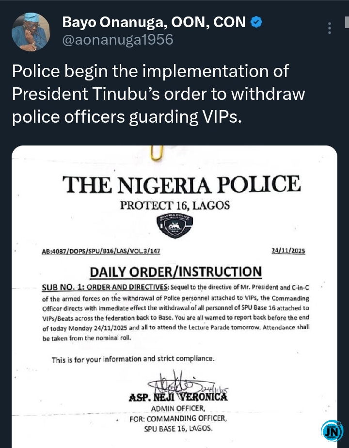 This action gained widespread public attention after a circulating internal memo—shared by presidential aide Bayo Onanuga on X (formerly Twitter)—confirmed that the implementation process had already begun, prompting discussions about its immediate implications for both VIPs and national security operations.