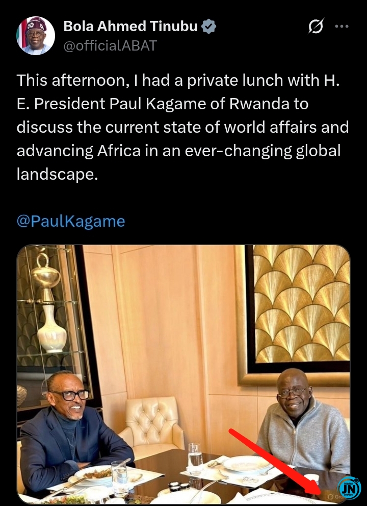 A photograph purporting to show President Bola Tinubu meeting with Rwandan President Paul Kagame has ignited widespread discussion and controversy on social media, after users noticed a prominent Grok watermark on the image, prompting questions about its authenticity.