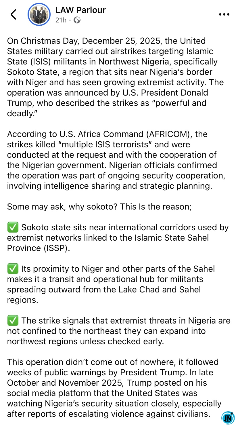 The lawyer, identified on Facebook as Law Parlour, claimed that the United States military confirmed the strike was carried out in collaboration with the Nigerian government, with both countries working closely on intelligence gathering, logistics, and security coordination.