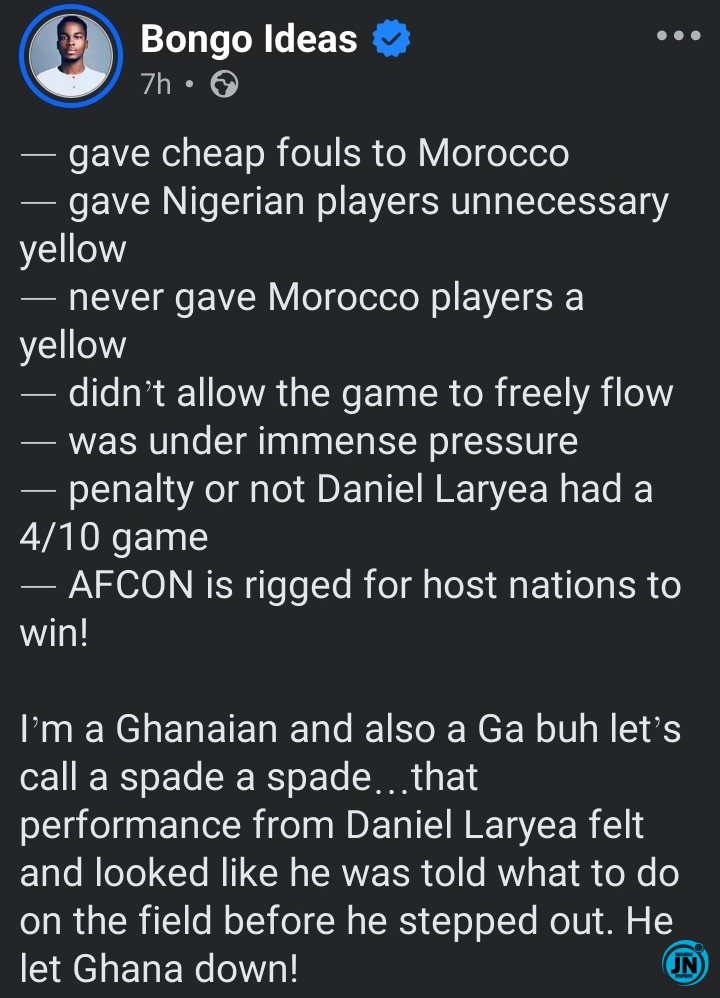 A Ghanaian social media commentator, Bongo Ideas, has ignited fresh debate online after publicly criticising the referee who officiated the tense and highly watched match between Nigeria and host nation Morocco in the ongoing Africa Cup of Nations (AFCON) tournament.