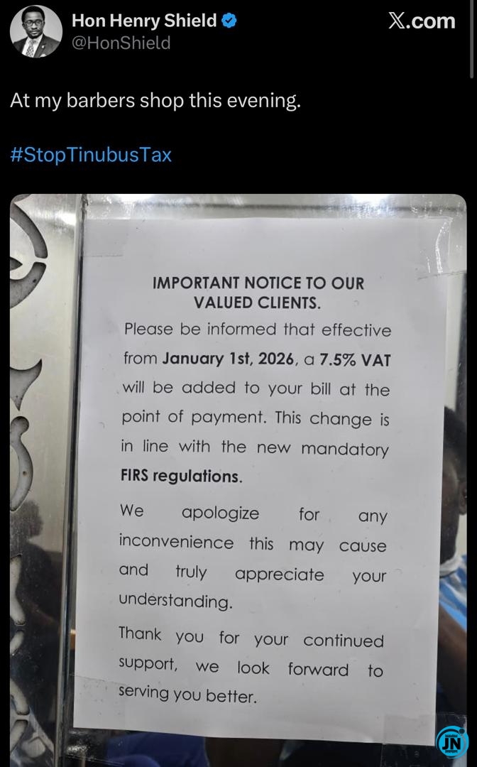 According to a notice that has since gone viral on social media, the barber informed customers that beginning from January 1, 2026, a 7.5% VAT would be added to every service payment made at the shop, including regular haircuts and grooming services.