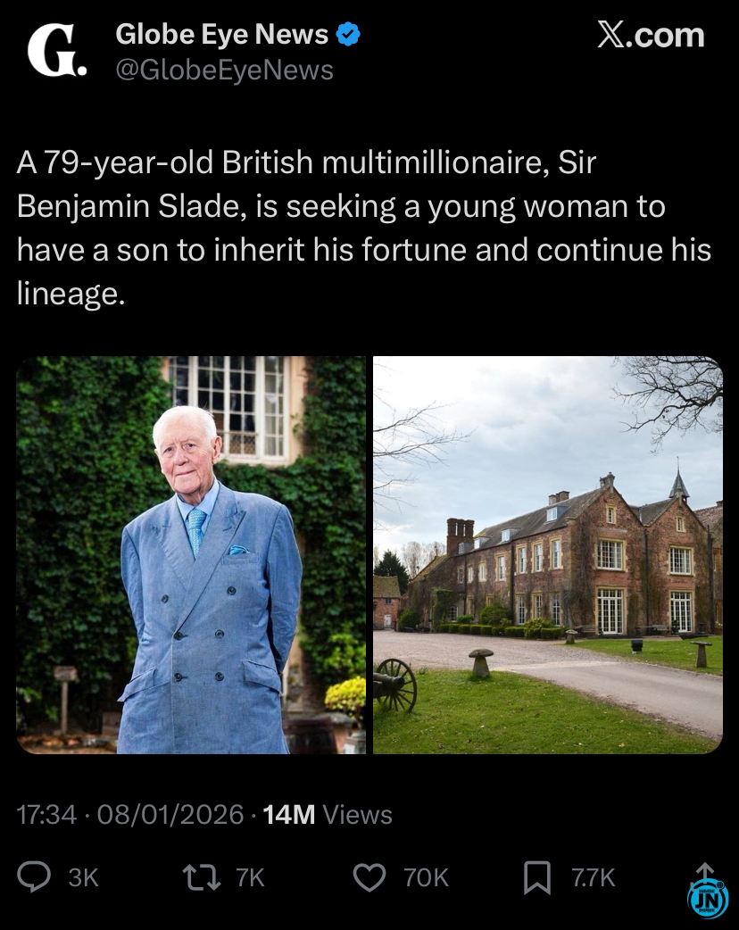 A 79-year-old British multimillionaire and aristocrat, Sir Benjamin Slade, has captured global attention after publicly announcing that he is seeking a young woman to marry and bear him a son. The announcement has gone viral, with many on social media reacting to his unusual request. Slade’s primary motive is to secure a male heir who can inherit his considerable fortune and continue his family lineage, a concern he has expressed repeatedly in recent years.