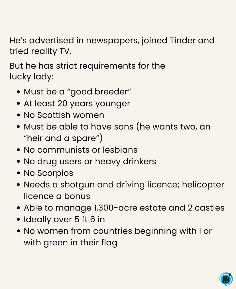 Sir Slade has reportedly placed advertisements seeking a woman in her 20s or 30s who is willing to enter into marriage with him for the explicit purpose of producing a male child. The proposed arrangement is not limited to mere companionship; it also includes a substantial financial incentive, with an annual salary of up to £50,000. Additionally, the woman would receive luxury perks including access to a private jet, high-end accommodations, and the chance to live a lavish lifestyle on the countryside estate.