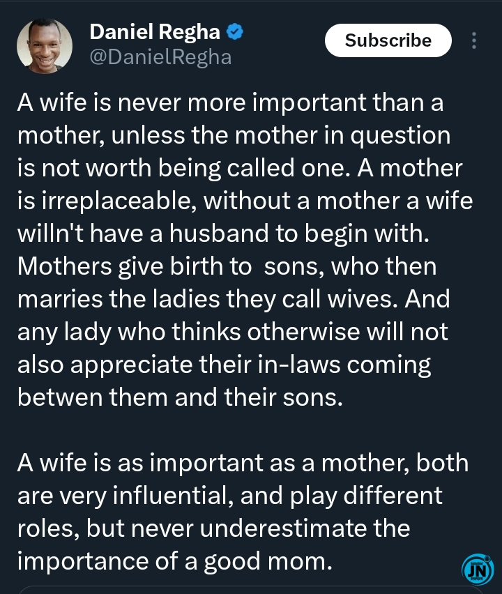 Daniel Regha, a popular social media commentator, has openly disagreed with an X user who claimed that a wife should be considered more important than a mother, a statement that has since ignited heated conversations across social media platforms.